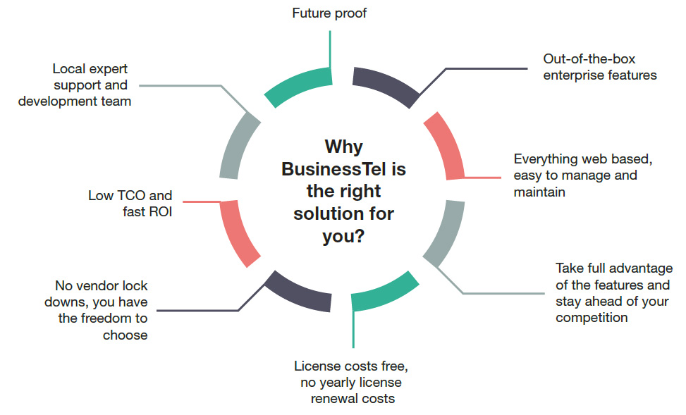 BusinessTel IPPBX series is a hybrid telephony solution which caters for both IP and analog telephony. It is built to seamlessly integrate into your organization and provide you with a competitive edge. With the license cost free model, you have the flexibility to enable the enterprise features that comes with BusinessTel without any licensing costs.
